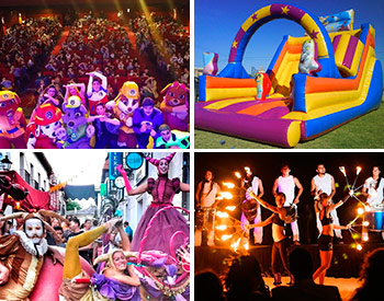 Podemos proporcionarle todo tipo de material y espectáculos para eventos, ferias, espectáculos, etc... Parques infantiles, castillos hinchables, payasos, cuentacuentos, pasacalles, espectáculos de magia, striptease, drag queens, etc... Todo lo que necesite para que su fiesta sea especial. Así mismo nos encargamos del alquiler de carpas, sillas, gradas, vallas, barreras de seguridad, etc...